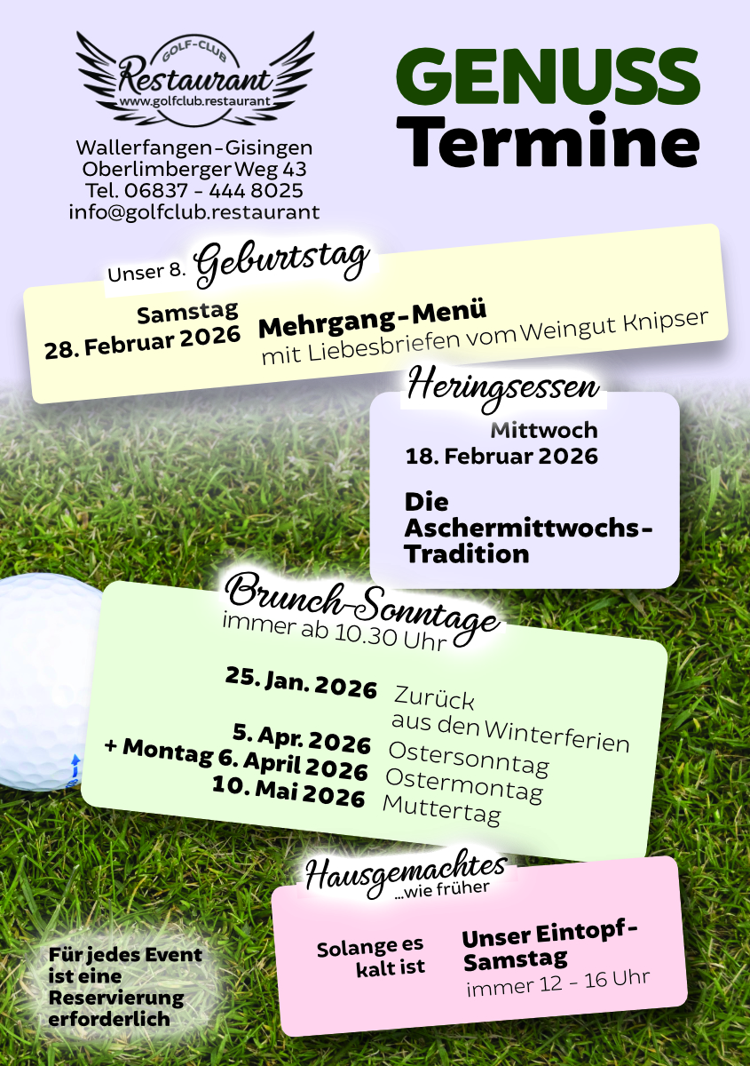 Zu Beginn des Jahres 2018 wurde uns die Führung eines Schmuckstücks im Saargau anvertraut. Das Restaurant in Wallerfangen-Gisingen befindet sich in einem herrlichen großen eingeschossigen Clubhaus aus den 60er-Jahren im amerikanischen Landhausstil, mit einem großen Kamin mitten im Gastraum (ca. 30 Sitzplätze), einer Sonnenterrasse für ca. 80 Personen sowie einem großen Nebenraum für weitere ca. 100 Personen.
